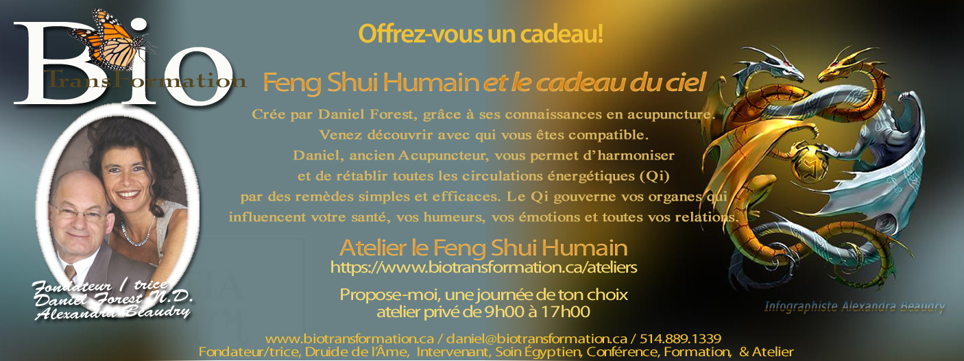 Je suis père de deux belles filles dont une est née aveugle mais avec des capacités différentes, elle voit des choses dans l’énergie que je ne vois pas. Mais comment est-ce possible! Pour la comprendre et l’aider de mon mieux, j’ai décidé d’aller étudier à l’université de Montréal les sciences du paranormal. Et ce fut le début de la grande aventure menant à la création du soin de BioTransformation. Plus tard avec ma fille, j’ai étudié un soin égyptien avec DR Jean-Philippe Marcoux, qui promettait beaucoup mais j’espérais des résultats beaucoup plus rapides. Alors j’ai fait plusieurs changements importants avec un amalgame de tous mes savoir. C’est ainsi que j’ai créé le soin BioTransformation. Depuis 2005 avec Alexandra, ma partenaire de vie, et une Grande équipe d’êtres divins, ange, Archange, guide, Merlin, Geronimo, Melchisédech, pour ne nommer que ceux-ci, nous avons poursuivi cette quête d’améliorer nos services. Avec Alexandra, tout est plus imagée (une image vaut milles mots) afin de rendre l’expérience du soin encore plus mémorable, significative et évolutive. Elle est guidée et connectée (canalise) divinement travaillant toujours selon le plan divin de l’individu. Elle contribue à accélérer le soin puisqu’elle peut identifier la nature du blocage vécu par la personne. Des changements grandioses, et un émerveillement sont à prévoir. Pour compléter la grande équipe, nos 3 petits chiens chinois sont des collaborateurs parfaits car ils ont chacun une âme connectée au divin. Pendant le soin, leurs comportements sont décodés car habituellement ils sont silencieux alors s’ils se manifestent c’est pour nous informer de ce qu’ils ressentent en lien avec le soin.